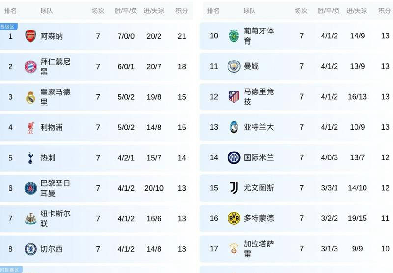 从积分榜情况观察,阿森纳凭借七连胜已提前锁定小组前两名,拜仁慕尼黑紧随其后积18分,皇家马德里和利物浦均拿到15分,热刺14分。这之后还有7支球队积13分,这些球队将极有可能展开16强席位的激烈拼争。英超入围前八的6支球队显示出整体竞争力极强,其他联盟中,只有皇马、萨拉戈萨(原文“皇萨仁”应为皇马和萨拉戈萨)、巴黎圣日耳曼、葡萄牙体育、马德里竞技及亚特兰大等少数几队能够比肩。